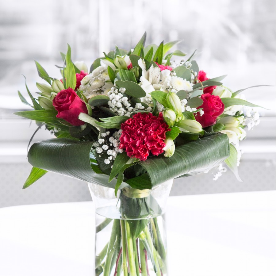 Introduce a burst of color and energy to your celebrations with our vibrant floral arrangement. This bouquet is a medley of striking white chrysanthemums, soft gypsophila, impassioned red roses, and charming carnations, accented by elegant white alstroemeria and distinctive aspidistra leaves. Each specimen is carefully chosen to offer both visual allure and enduring freshness.
